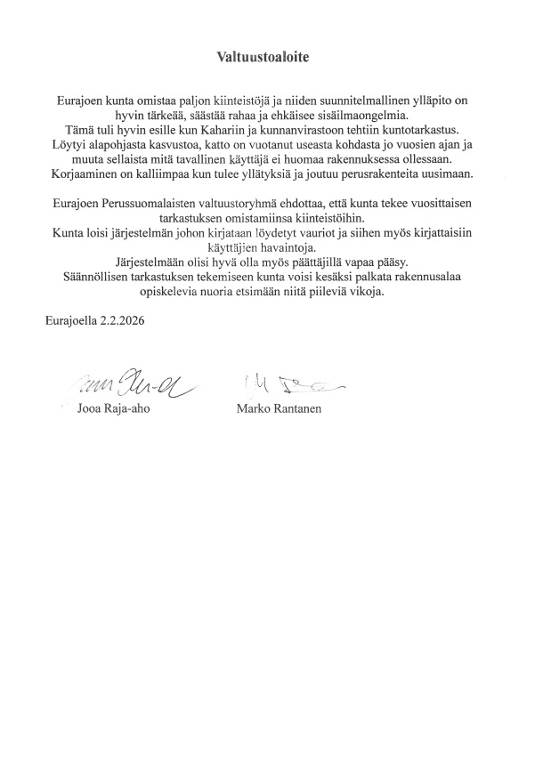 2.2.2026 Valtuustoaloite 2026 / vuosittainen tarkastus kunnan omistamiin kiinteistöihin